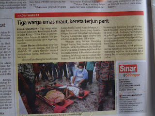 Hatiku berdetik untuk memikirkan masalah ini, dalam kemelut minyak naik ni, ada lagi benda lain yang amat penting sebenarnya, kalau nyawa dah tiada, segalanya tidak ada lagi ertinya, hal minyak ker hal politik ker satu sen pun tak guna. Apa yang dapat aku kongsikan pun tak banyak, sekadat berkongsi pengalaman. LAgipun aku tak berapa berani nak ambil gambar kemalangan, sedih lagi lagi yang melibatkan hal kematian, Masa hari ahad lepas selepas penat shooting pengantin, masa dalam perjalanan tu ada kemalangan di parit 4 sekinchan, sila lihat lampiran di akhbar sinar. mula mulanya aku malas nak shoot tapi tengok ada tempat parking aku pun turun la dengan kengkawan yang lain. banyak juga aku shoot, tapi sebenarnya aku tak sampai hati melihatnya apatah lagi kemalangan yang melibatkan kematian, aku turut merasa sedih, nasib baik aku tak jadi jurugambar forensik... huu takut.. masa shoot kejadian tu pun aku rasa menggeletar sikit tapi gambar tak blur walaupun takda Image Stabilizer. Lepas tu aku telefon sekabar sinar kalau dia nak gambar, hal berita dia call jer balai. aku terus apload gambar tuh bagi kat dia. masuklah majalah sinar keesokan harinya.